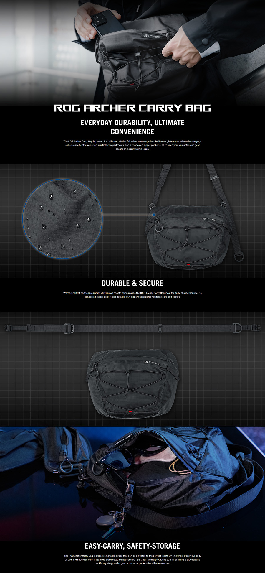 - ROG Archer Carry Bag is made of durable, water-repellent 200D nylon and features adjustable straps, a side-release buckle key strap, multiple compartments, and a concealed zipper pocket.