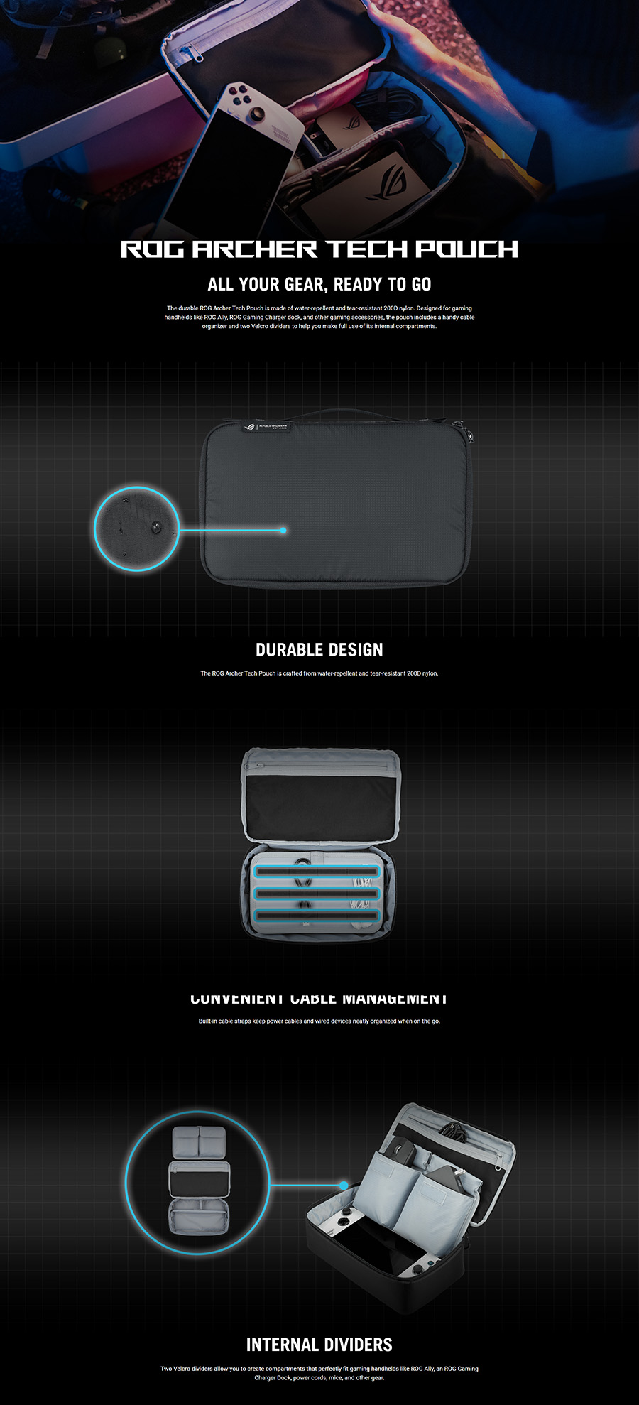 - The durable ROG Archer Tech Pouch is made of water-repellent and tear-resistant 200D nylon. Designed for gaming handhelds like ROG Ally, ROG Gaming Charger dock, and other gaming accessories, the pouch includes a handy cable organizer and two Velcro dividers to help you make full use of its internal compartments.