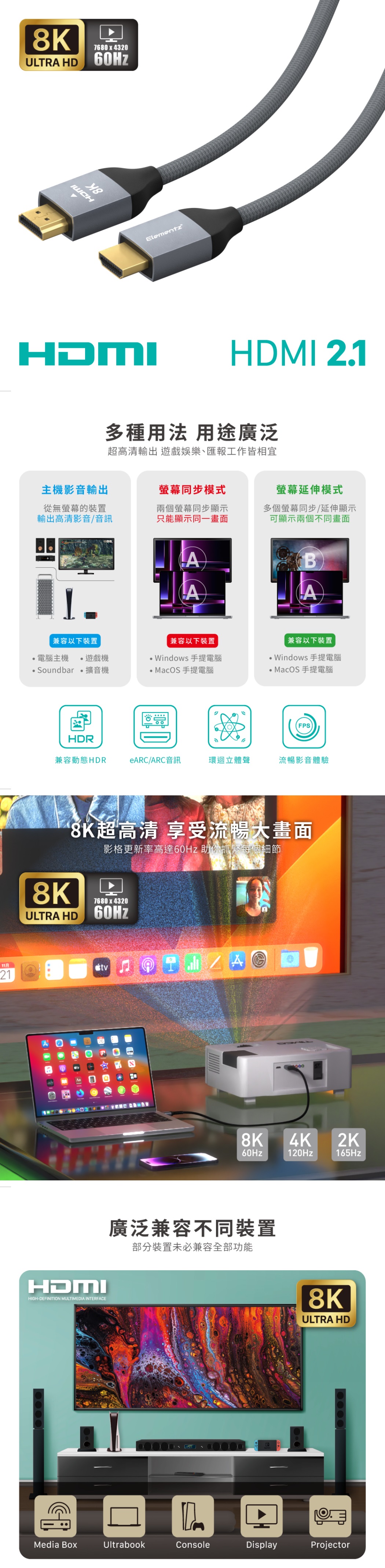 - 兼容 HDCP 協定及3D輸出, eARC/ARC, HDR,線材規格符合 HDMI 2.1