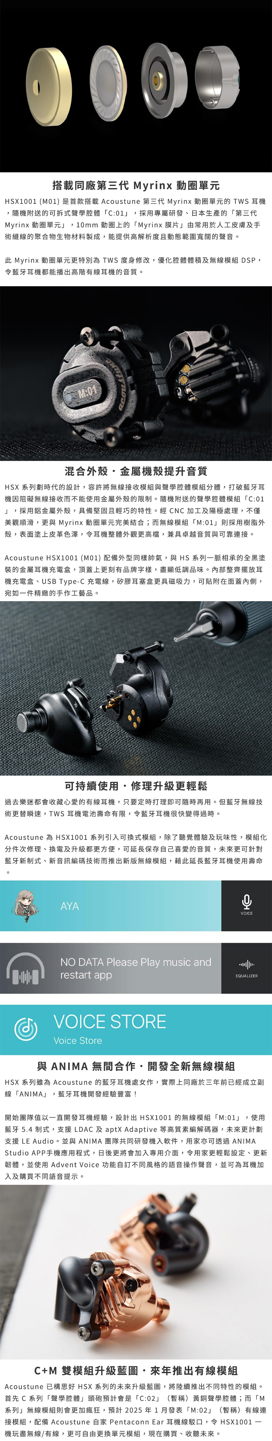 Acoustune HSX1001 系列的模組升級設計,日後可以為耳機更換電池、升級藍牙版本和更換腔體,讓耳機持續發展。市場上少有金屬腔體的藍牙耳機,Acoustune 傳統上透過高品質的金屬材料來調校聲音,確保音質的卓越表現。