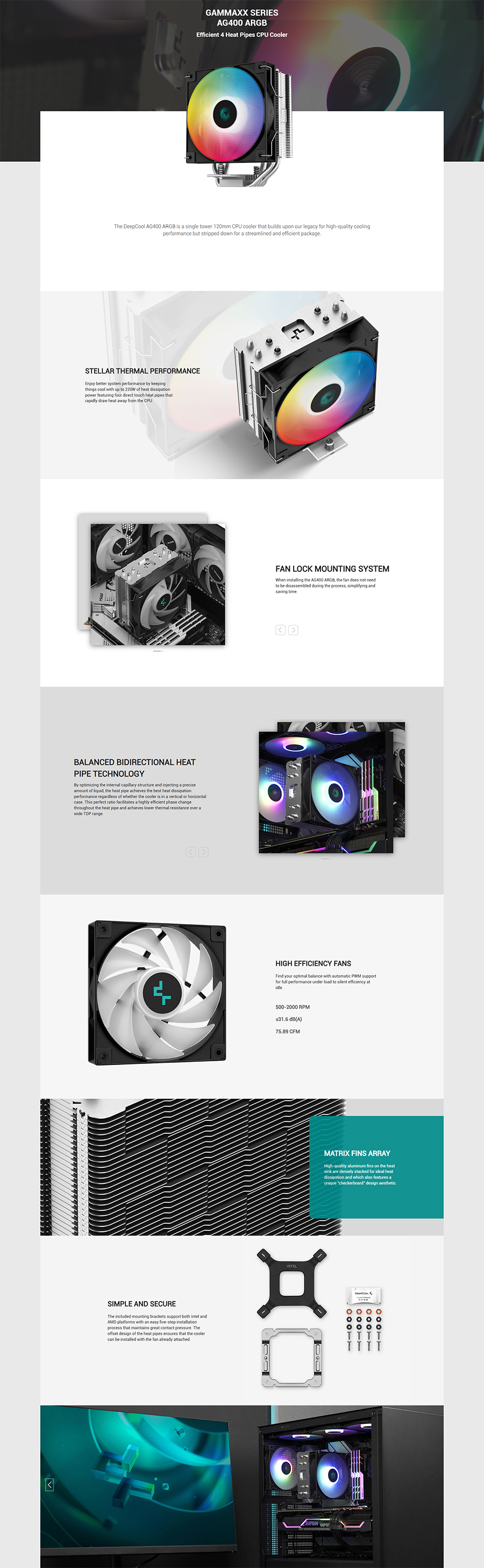 The DeepCool AG400 ARGB is a single tower 120mm CPU cooler that builds upon our legacy for high-quality cooling performance but stripped down for a streamlined and efficient package