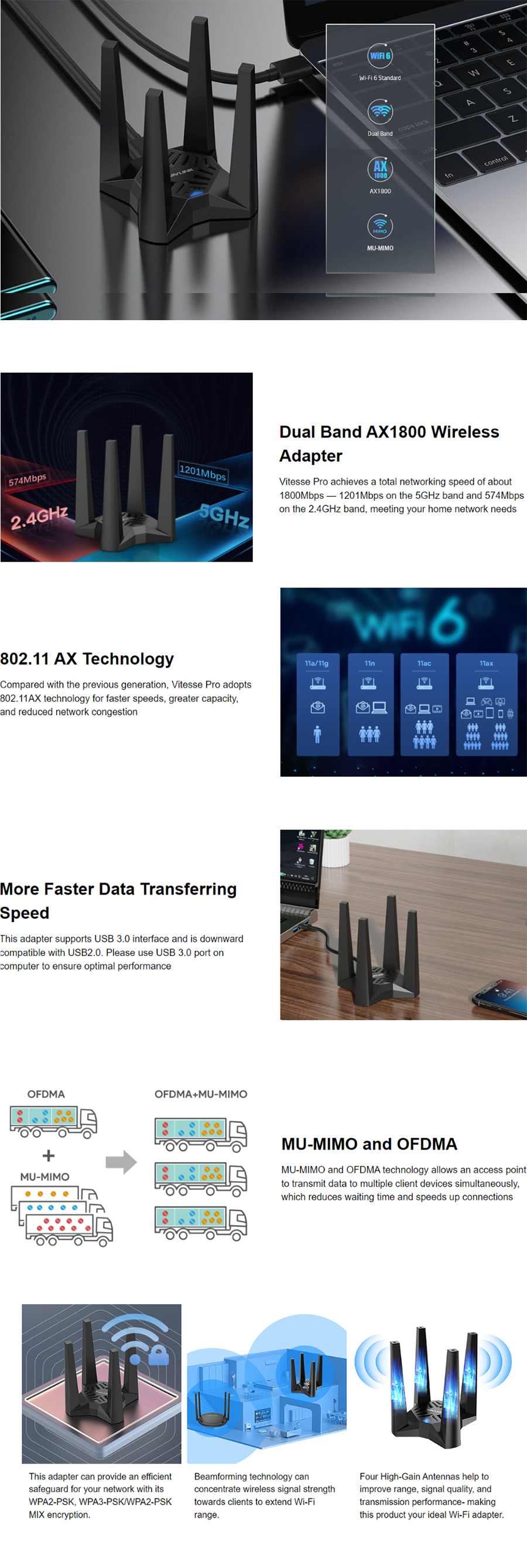 - 此 WiFi 適配器支援最新安全協定 WPA3 加密,為個人密碼安全提供增強保護