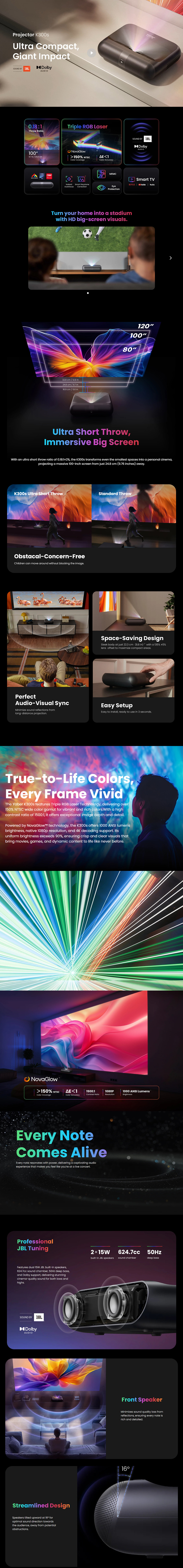 - 投射比例為0.18:1,對比度為1500:1,可提供卓越的影像深度和細節