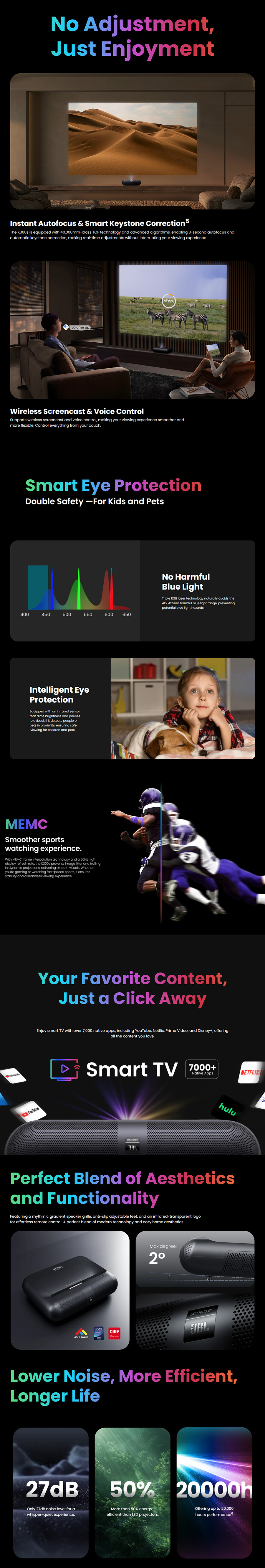 - 配備MEMC運動補償技術和 60Hz 高顯示刷新率,可防止動態投影中的影像抖動和拖尾,體驗更流暢的運動觀賞