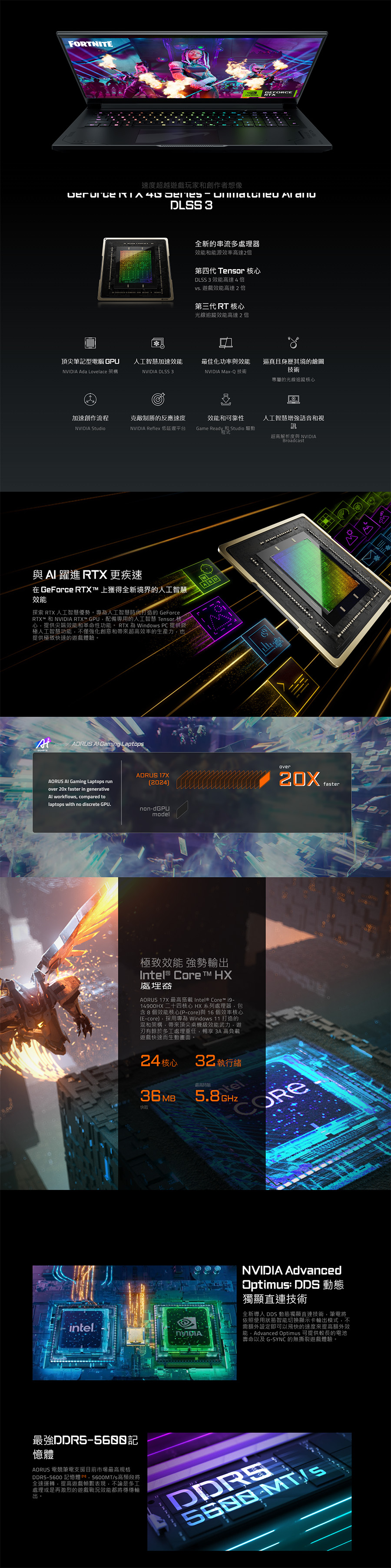 AI 隨行,引領電競!全新AORUS 17X 最高搭載 Intel® Core™ i9-14900HX系列處理器,配有滿血 TGP 的 NVIDIA® GeForce RTX™ 40 系列獨立顯卡,通過人工智慧加速進行生成式AI,帶來無可匹敵的效能武力與人工智慧強化技術。