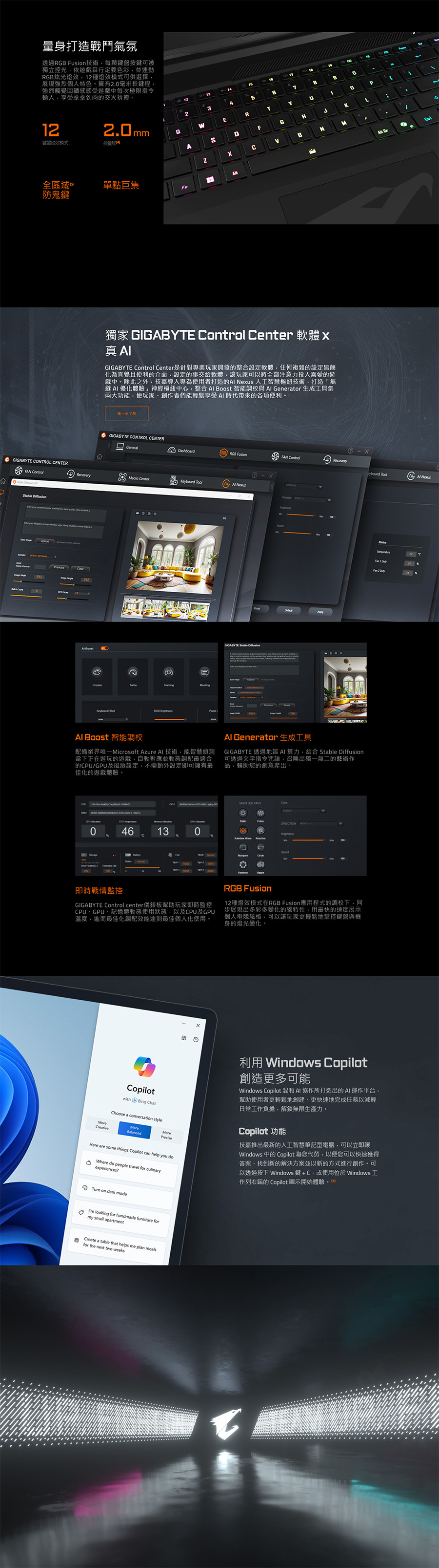 Per-key RGB Backlit Keyboard, Up to 2.0mm Key-travel (Support N-Key, with 10-Key)