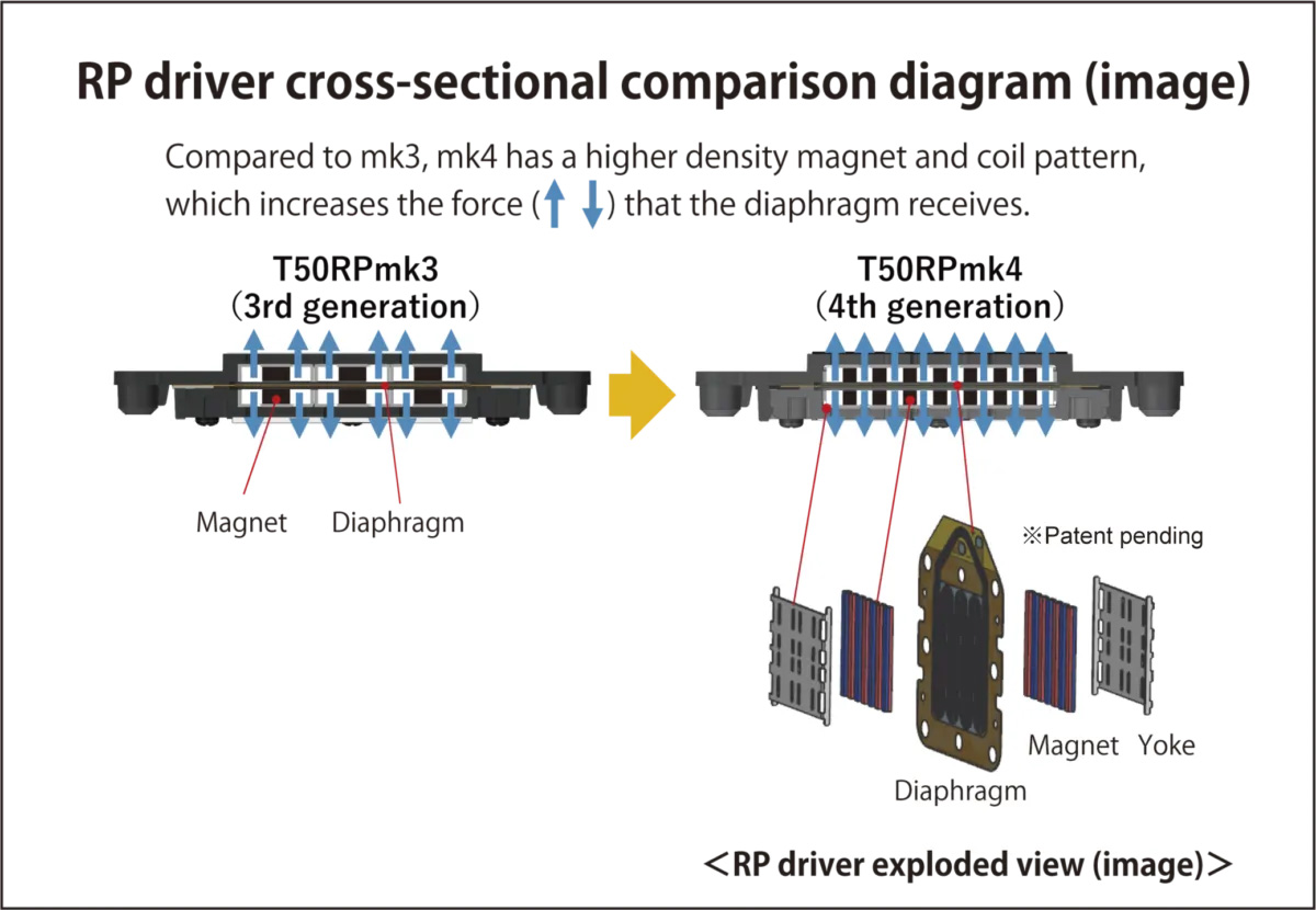 第四代 RP 單元技術:這項技術在過去 50 年內不斷改進,現已進化到第四代。主要改進包括增加夾住振膜的磁鐵數量,並重新設計了印刷線圈的圖案形狀。
