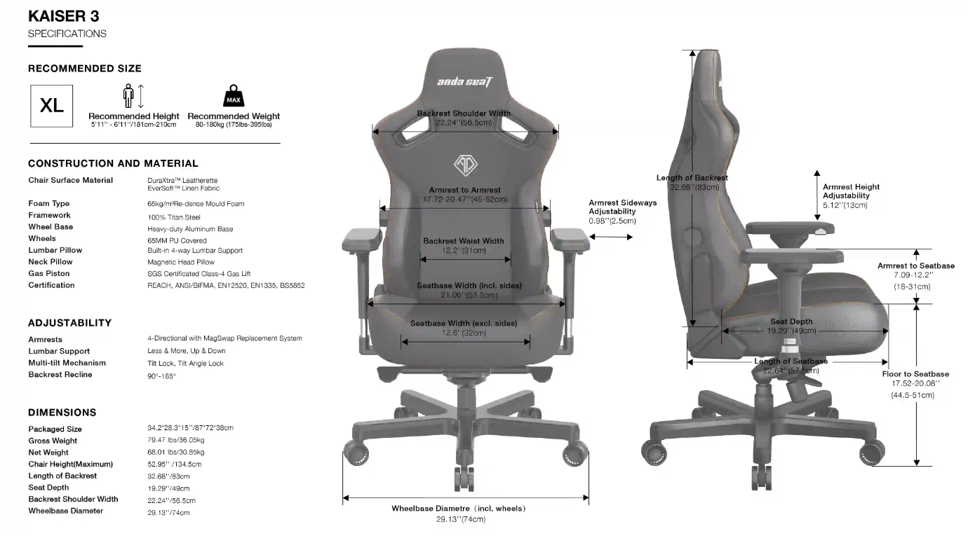 65kg/m3 Re-Dense模壓泡沫,強度和彈性的完美結合,用於提升密度,延長壽命,並緩解座椅隨著時間的推移“下垂”的問題。 我們豪華的遊戲椅可防止您在遊戲或長時間工作時懶散。 帶上冒險,緊緊地坐在你的Anda Seat Kaiser 3上!