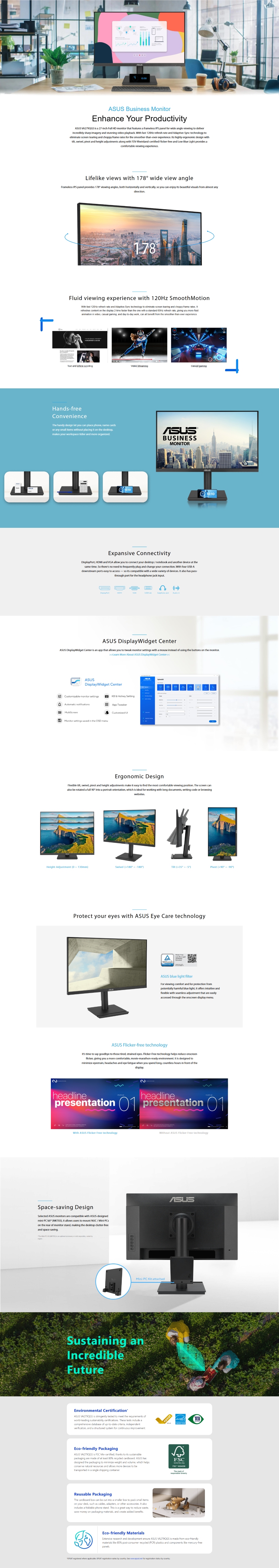 - ASUS Eye Care monitors feature TÜV Rheinland-certified Flicker-free and Low Blue Light technologies to ensure a comfortable viewing experience