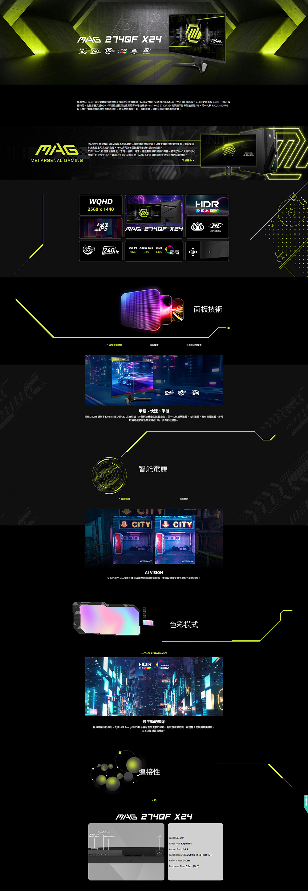 - Rapid IPS 面板-提供 0.5ms(GtG,最小值)快速反應時間,優化螢幕顏色和亮度