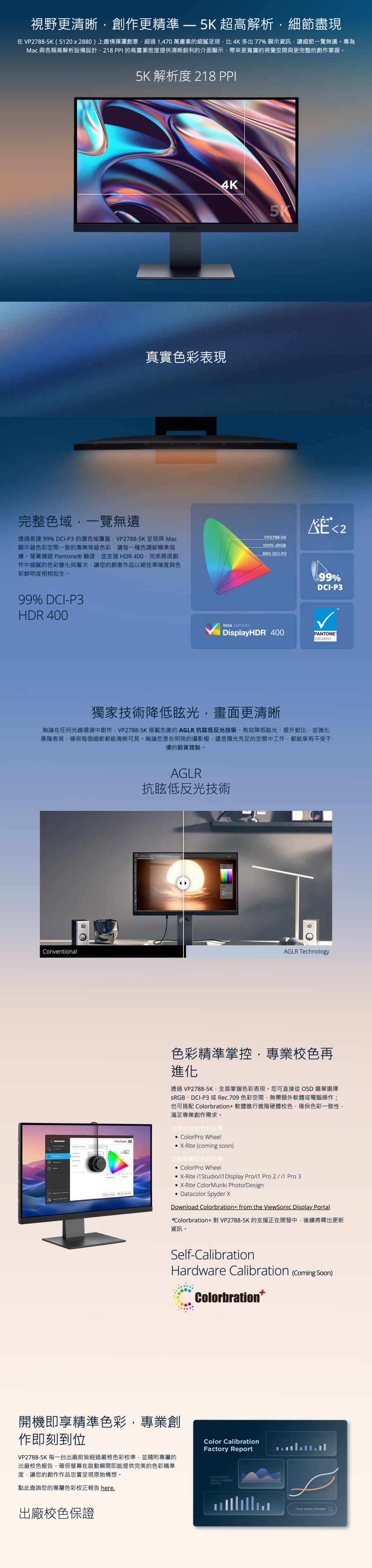 - 綻放原色:支援 99% DCI-P3 廣色域、HDR 400 影像技術,並提供軟體與硬體雙校色選項,呈現精準色彩還原效果。