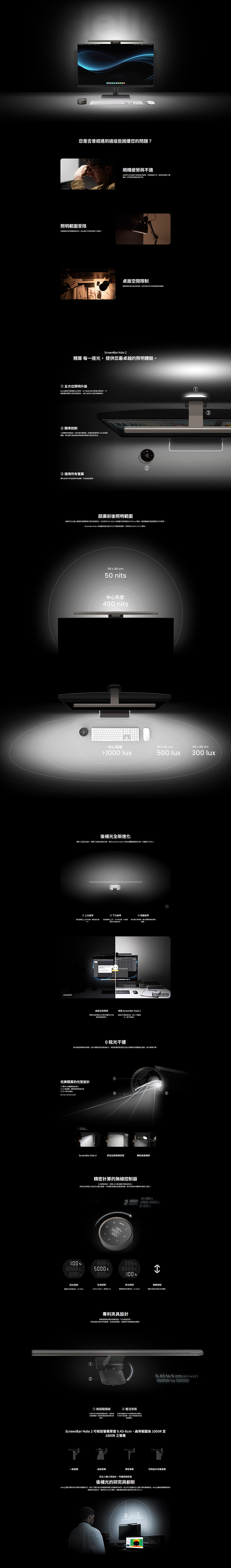 - 專利 ASYM-Light 非對稱光學,精準控光照亮桌面,螢幕0反光