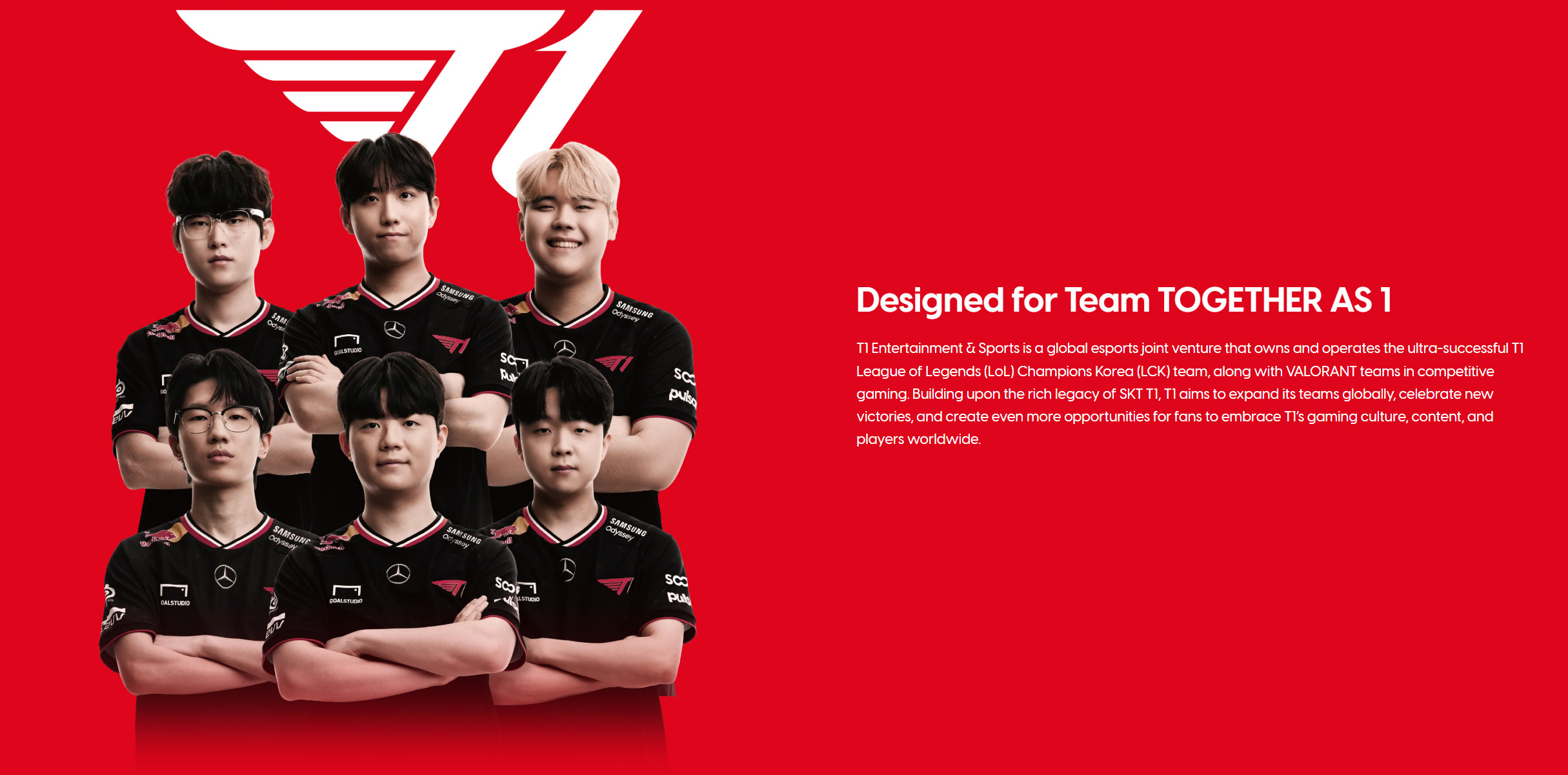 T1 Entertainment & Sports 是一家全球電競合資企業,旗下擁有傳奇戰隊 T1《英雄聯盟》(LCK)隊伍與 VALORANT 戰隊。延續 SKT T1 的輝煌歷史,T1 不斷拓展全球影響力,讓世界各地粉絲能更深入體驗 T1 的電競文化、內容與選手風采。