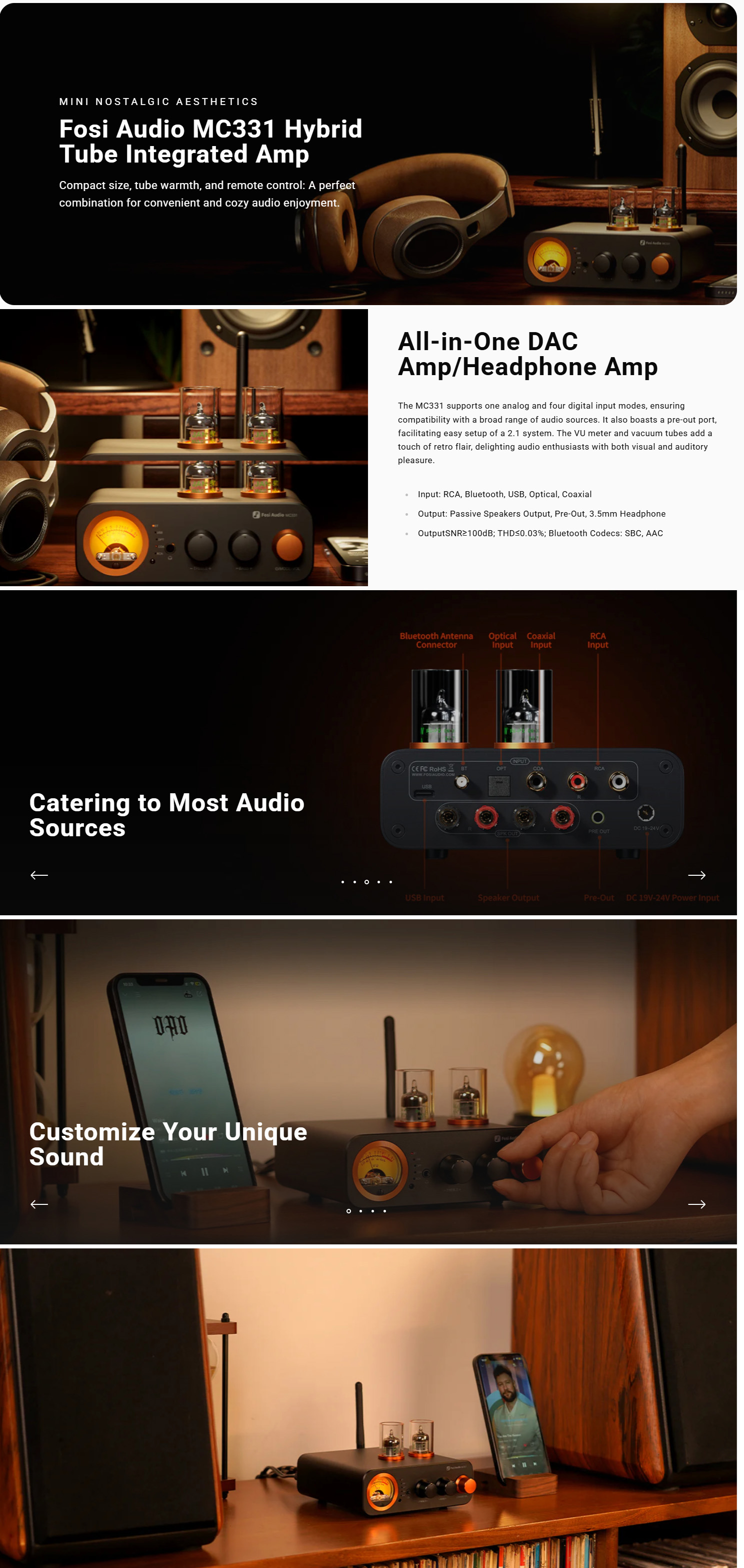 Fosi Audio MC331 是一款多功能真空管整合放大器,結合數位類比轉換器(DAC)、前置放大器、耳機放大器及揚聲器放大器,專為音響發燒友與追求復古美學的使用者設計。搭載 JAN 5654W 真空管與 VU 表,提供溫暖音色與懷舊視覺效果。以下為其主要特色: