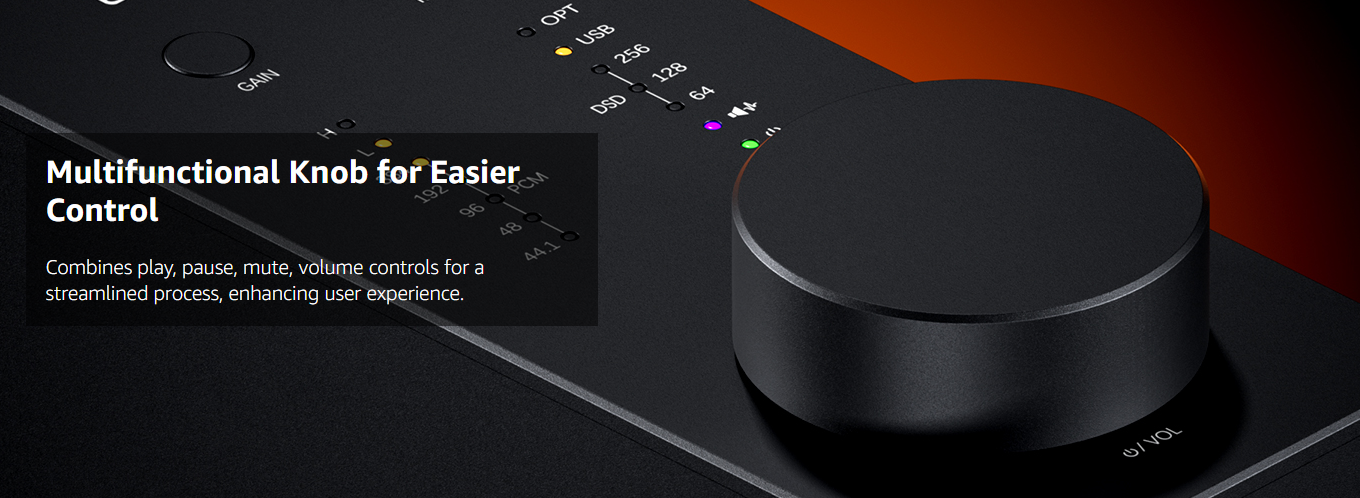 - 頂部 LED 指示燈顯示當前音訊格式(PCM/DSD)、增益設定(高/低)及輸入模式(USB/光纖),方便即時監控。
