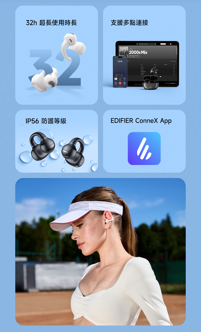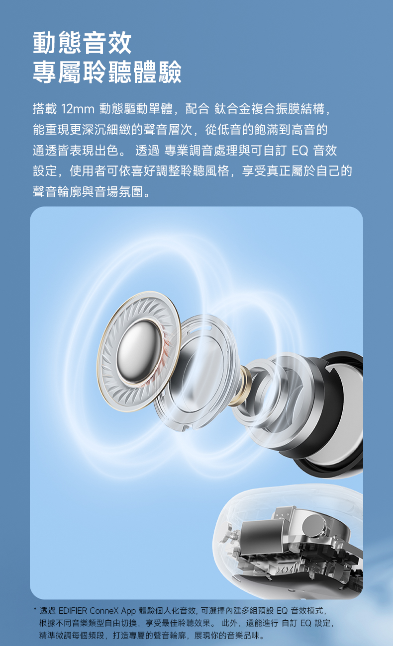 • 搭配 EDIFIER ConneX App,支援:一鍵啟動排水功能/自訂 EQ 音效/控制手勢設定/尋找耳機定位…等實用功能