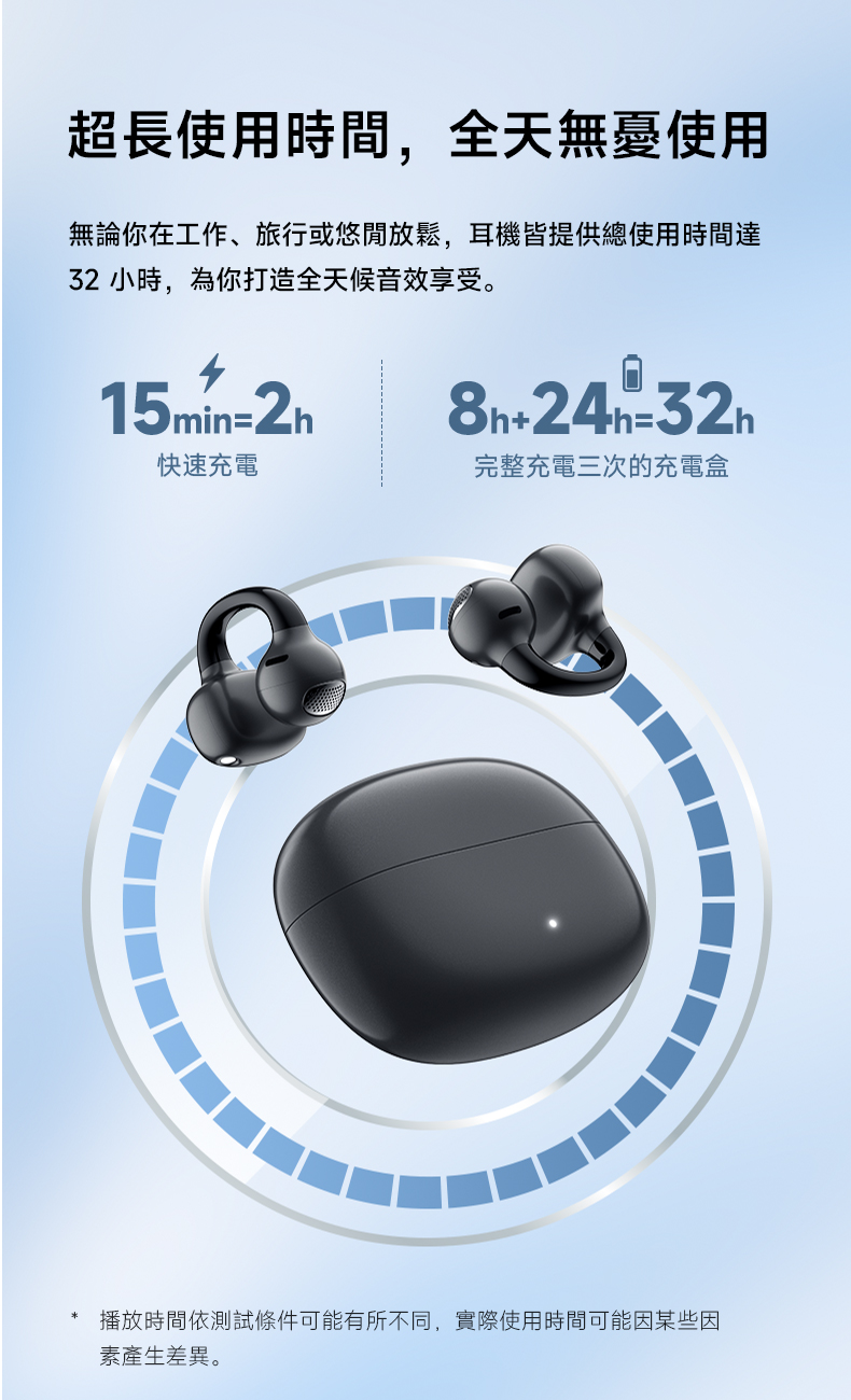 • 單次充電可使用 8 小時,搭配充電盒達 總使用時長 32 小時