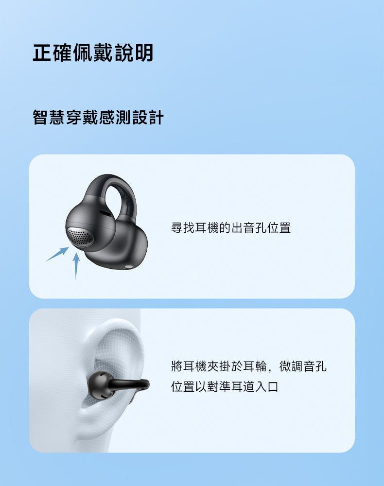 • Comfo Q 採用開放式夾掛設計,適用各種耳型,佩戴穩固且無壓力