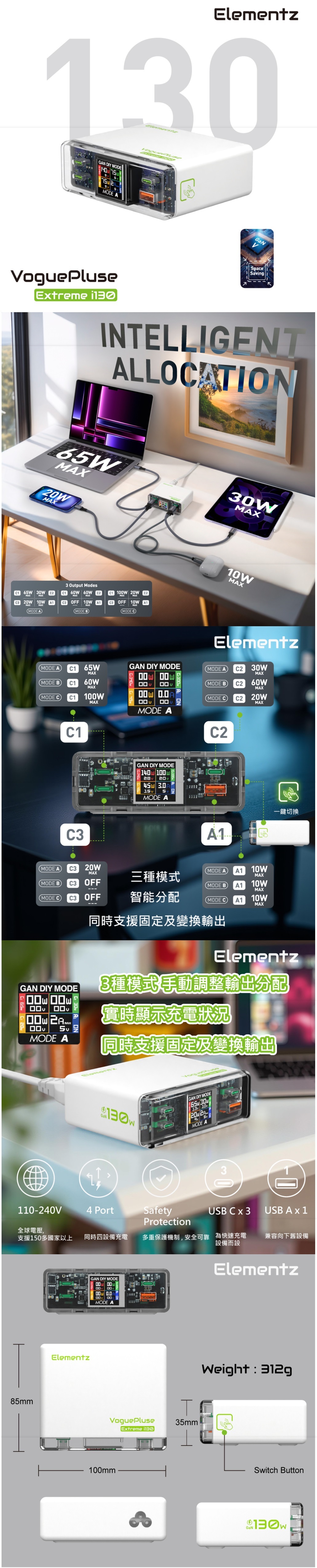 - 3C + 1A 4Port GaN 智能自訂分流技術, 三種模式選擇, 手動調整輸出接口