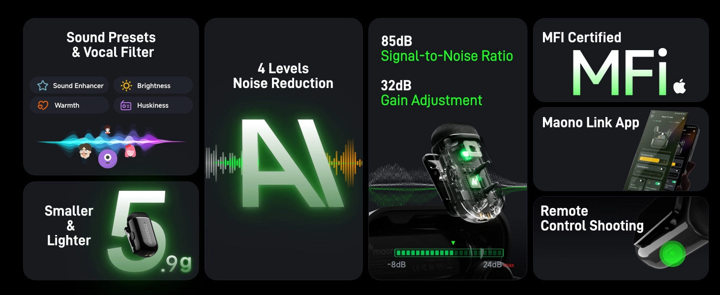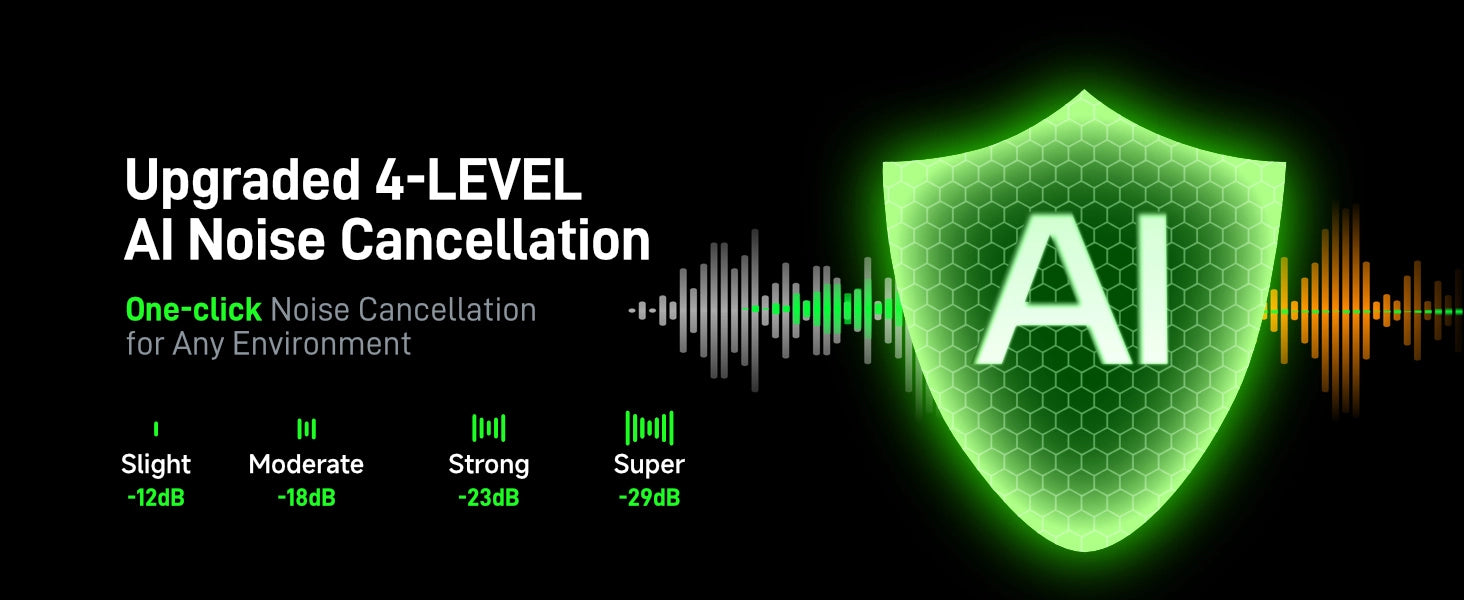 • 4 級 AI 降噪:支援一鍵開啟/關閉降噪功能,結合 32dB 增益控制和智能自動限制功能,確保在嘈雜環境中錄製出清晰豐富的音頻。