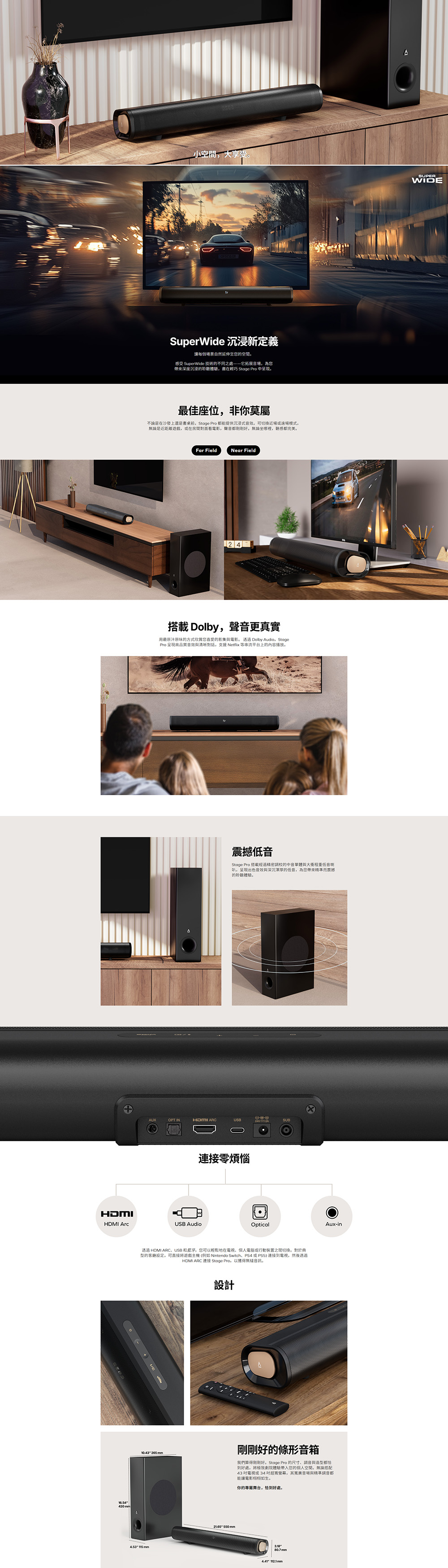 Stage Pro 搭載 Dolby Audio 的 2.1 聲道音響,帶來劇院級音效體驗