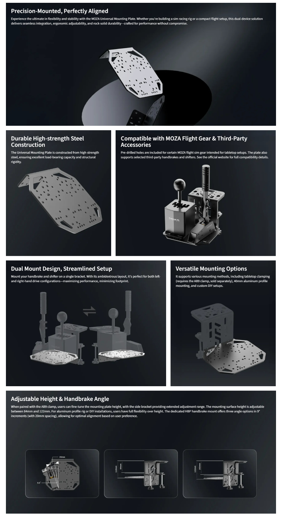 此支架具備可調整的高度與手煞車角度,提供多種安裝方式——包括桌面、型材支架及自訂設置——並廣泛相容於 MOZA 及部分第三方設備,採用耐用鋼材設計,堅固可靠。