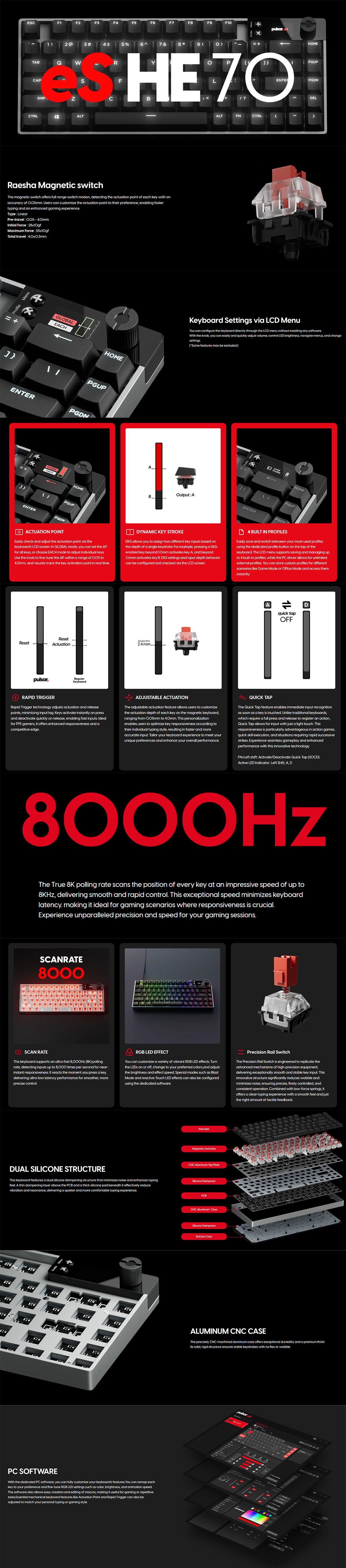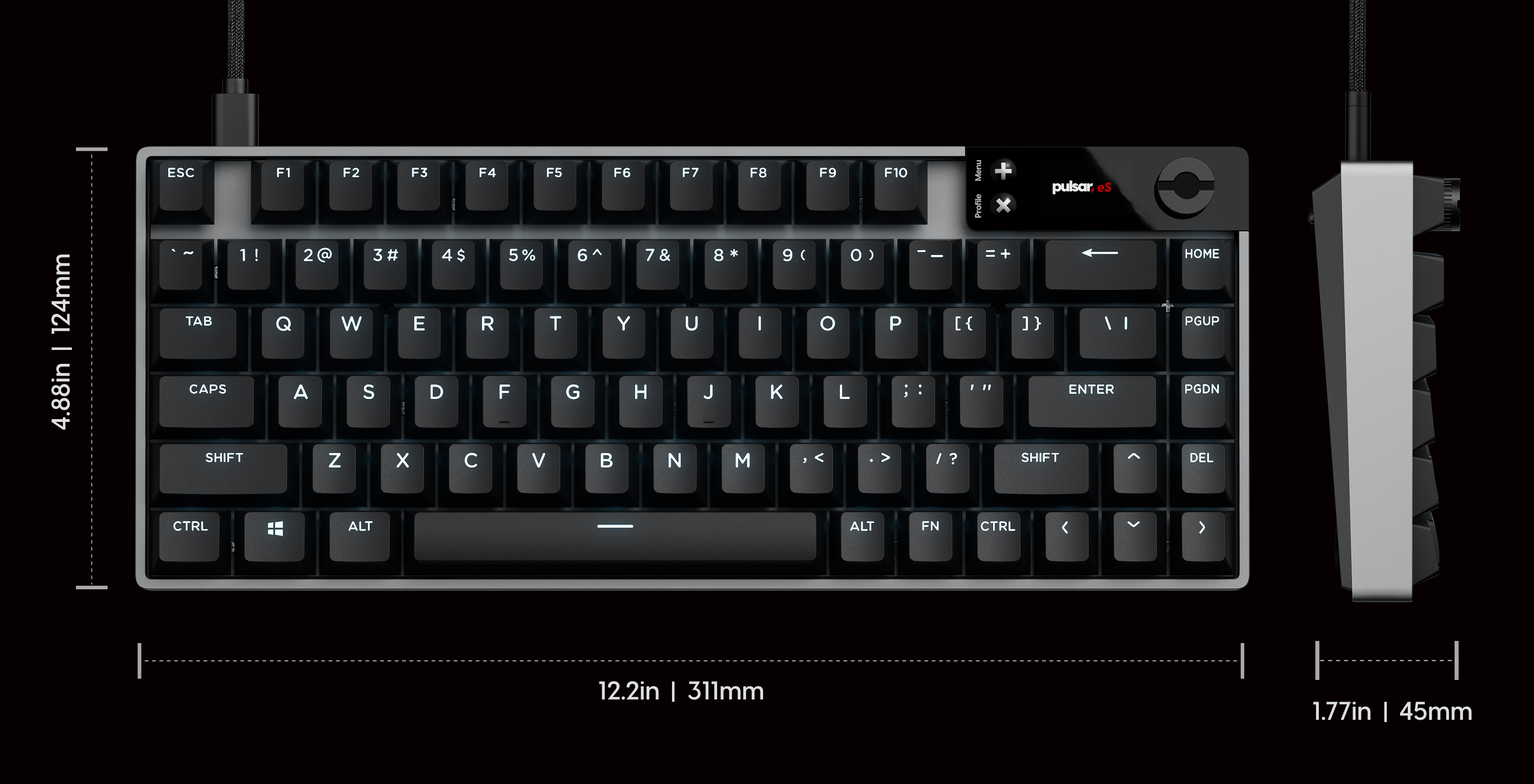 - 緊湊 70% 佈局:PULSAR eS HE 70 鍵盤採用緊湊的 70% 佈局,節省空間且便於攜帶。