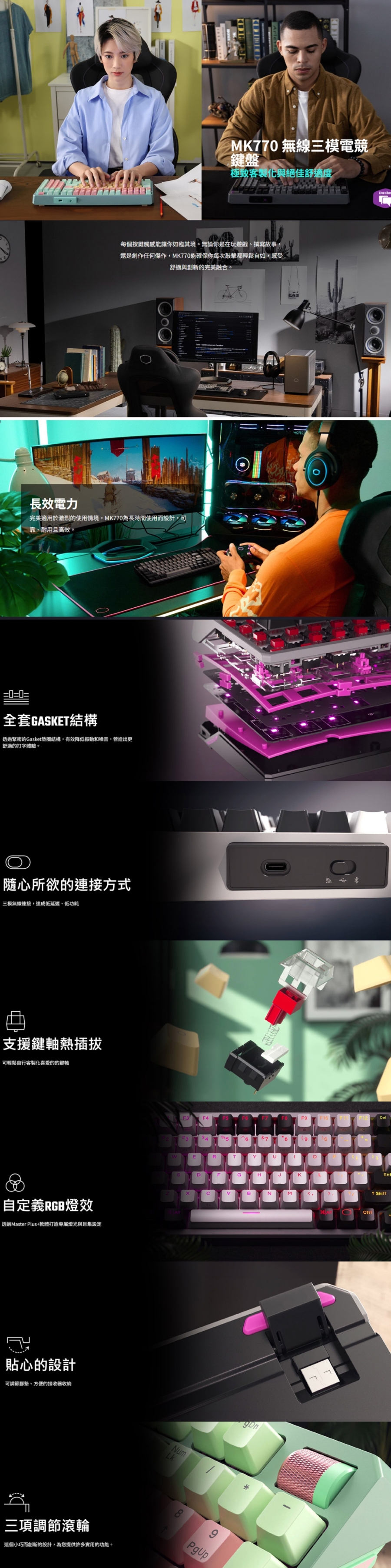 PBT 雙色射出成型鍵帽 / 鍵盤回報速率: 1000Hz (有線/ 無線 2.4GHz), 125Hz (藍牙) / 鍵盤多媒體鍵 / 作業系統 Windows 8+ / Mac OS X 10.10+ / Android / iOS / 鍵盤線材 1.8m,USB Type-C 可拆卸和線圈編織 / 全墊片結構: 墊片結構減少振動和噪音 / 熱插拔開關