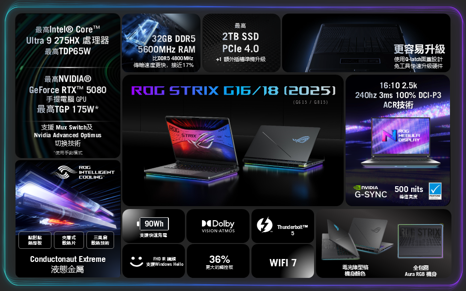 2x Thunderbolt™ 5 with support for DisplayPort™ / power delivery / G-SYNC (data speed up to 120Gbps)