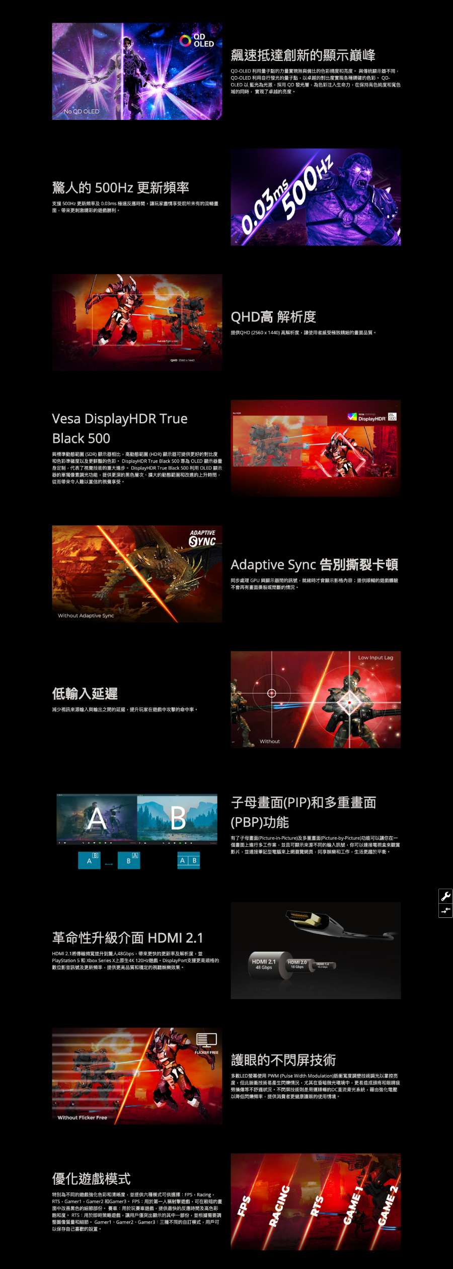 - 超高 500Hz 更新率與 0.03ms GtG 反應時間,確保極速流暢的遊戲體驗