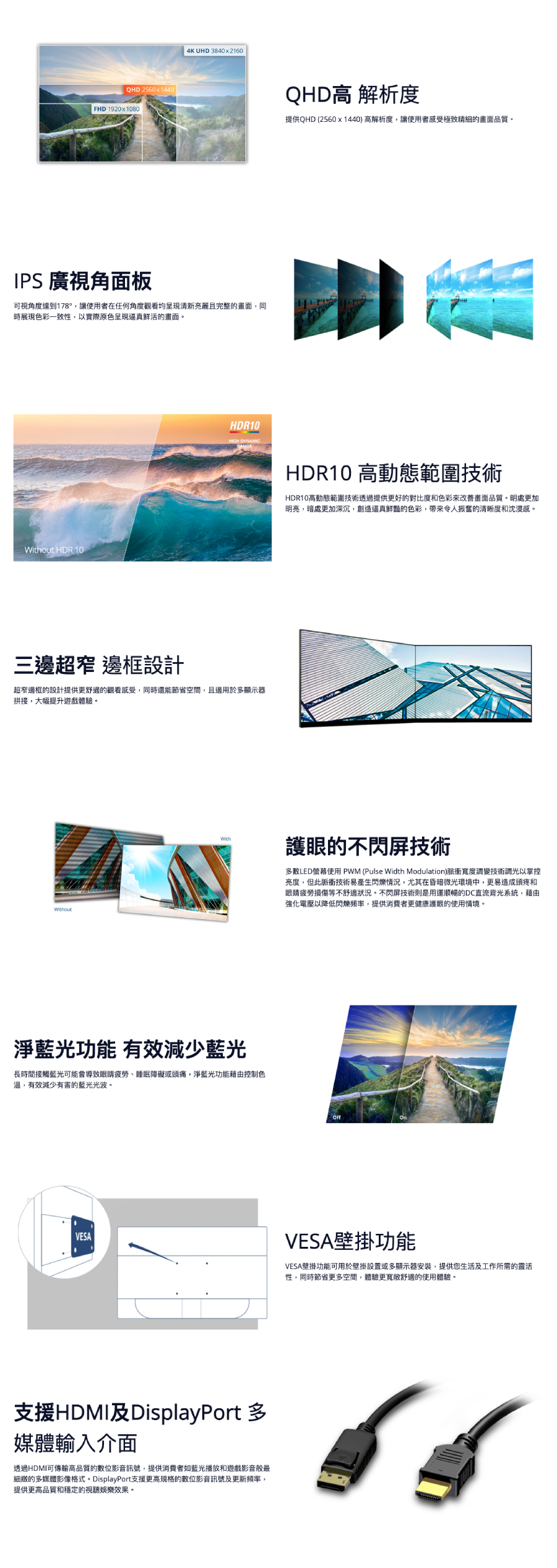AOC Q27B30E 27吋2K專業顯示器 — 高效辦公與精緻娛樂的完美平衡。 採用IPS廣視角面板與2560×1440 QHD高解析度,搭配HDR10技術,無論是處理精密設計圖稿或觀賞4K影音內容,都能呈現精準色彩與細膩畫質。75Hz刷新率與4ms快速反應時間有效減少畫面延遲,特別適合長時間文書處理與多工作業。超窄邊框設計提升多螢幕協作效率,配備不閃屏與低藍光技術,為您的視力健康把關。豐富的連接埠配置與VESA壁掛支援,讓辦公環境規劃更具彈性。