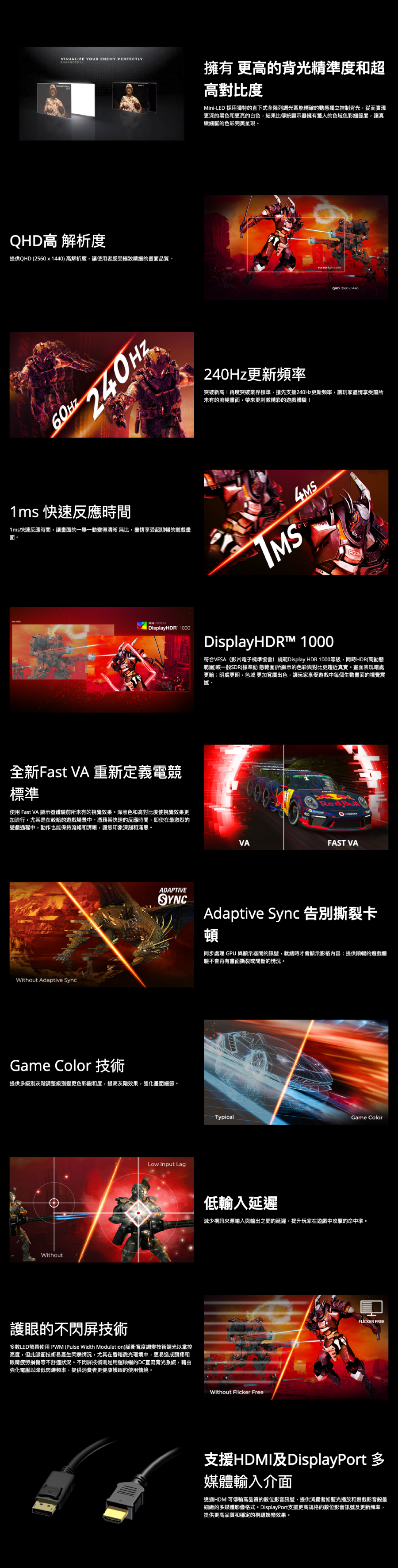 勇無止競,極速致勝! Q27G4ZMN 為 27 吋 MINI LED 電競顯示器,配備 MINI LED 1152 區、量子點技術、2K QHD @2560 X 1440 PX、240HZ 更新率、1MS 快速反應時間、Fast VA 面板、自適應同步技術、低輸入延遲、遊戲色彩、陰影控制、不閃屏技術及淨藍光模式。 Mini-LED 技術提供增強的亮度和超高對比度,黑色更深,白色更亮,而獨特的調光區域提供精確的背光控制,消除「光暈」效應。其結果是令人驚嘆的細節以及比傳統顯示器更準確的色彩再現!
