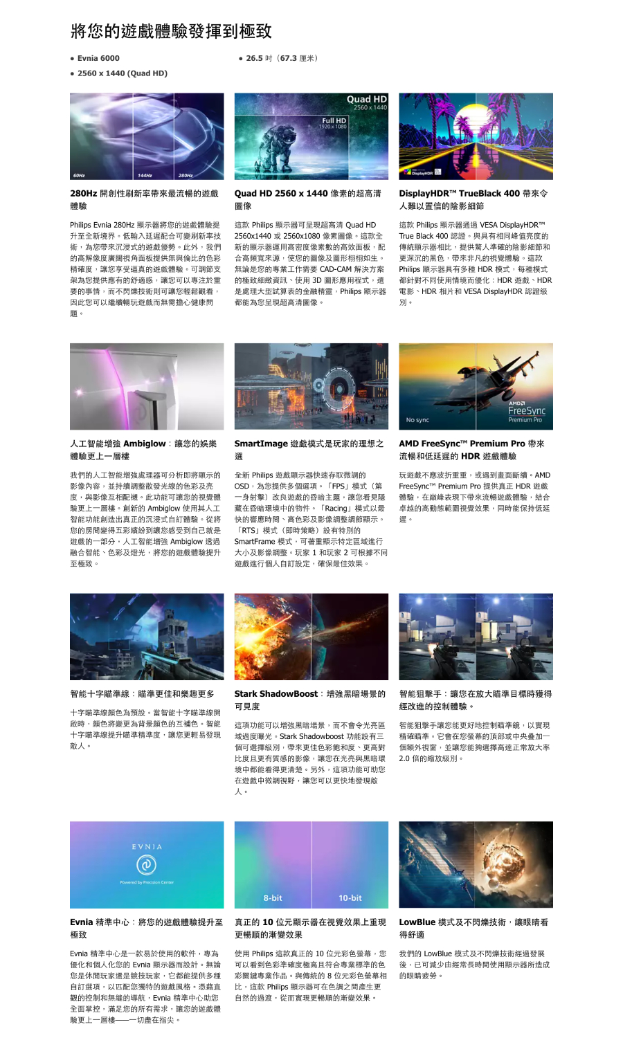 Kensington 鎖, VESA 支架(100x100 毫米), LowBlue 模式, MultiView 2x 裝置, PIP/PBP 模式, Ambiglow 3 邊, 低藍光 |