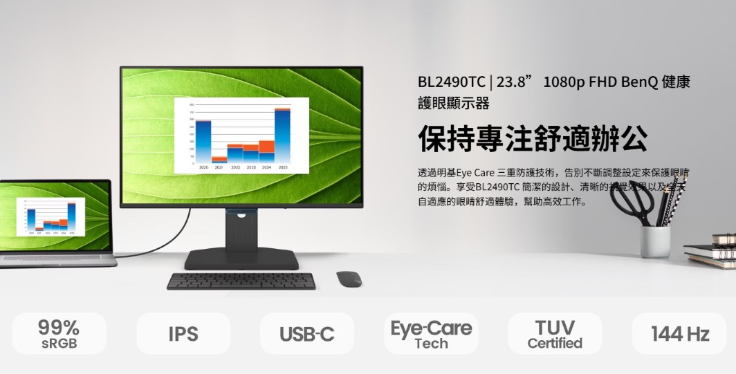 - TÜV雙重護眼認證:低藍光 + 無閃爍技術,長時間工作不疲勞