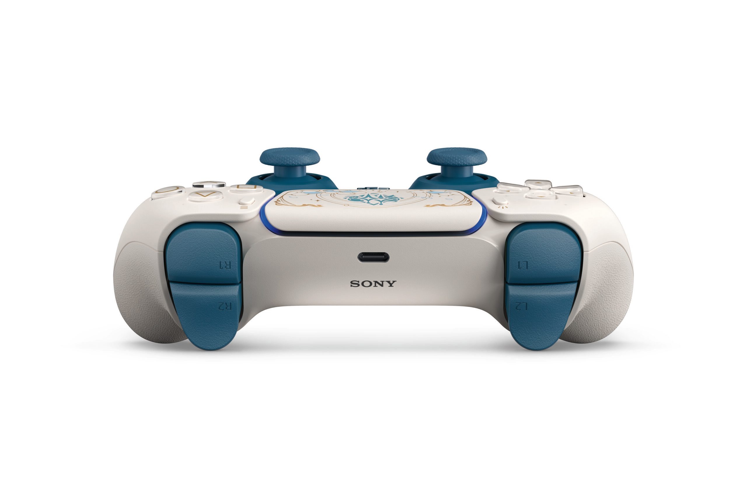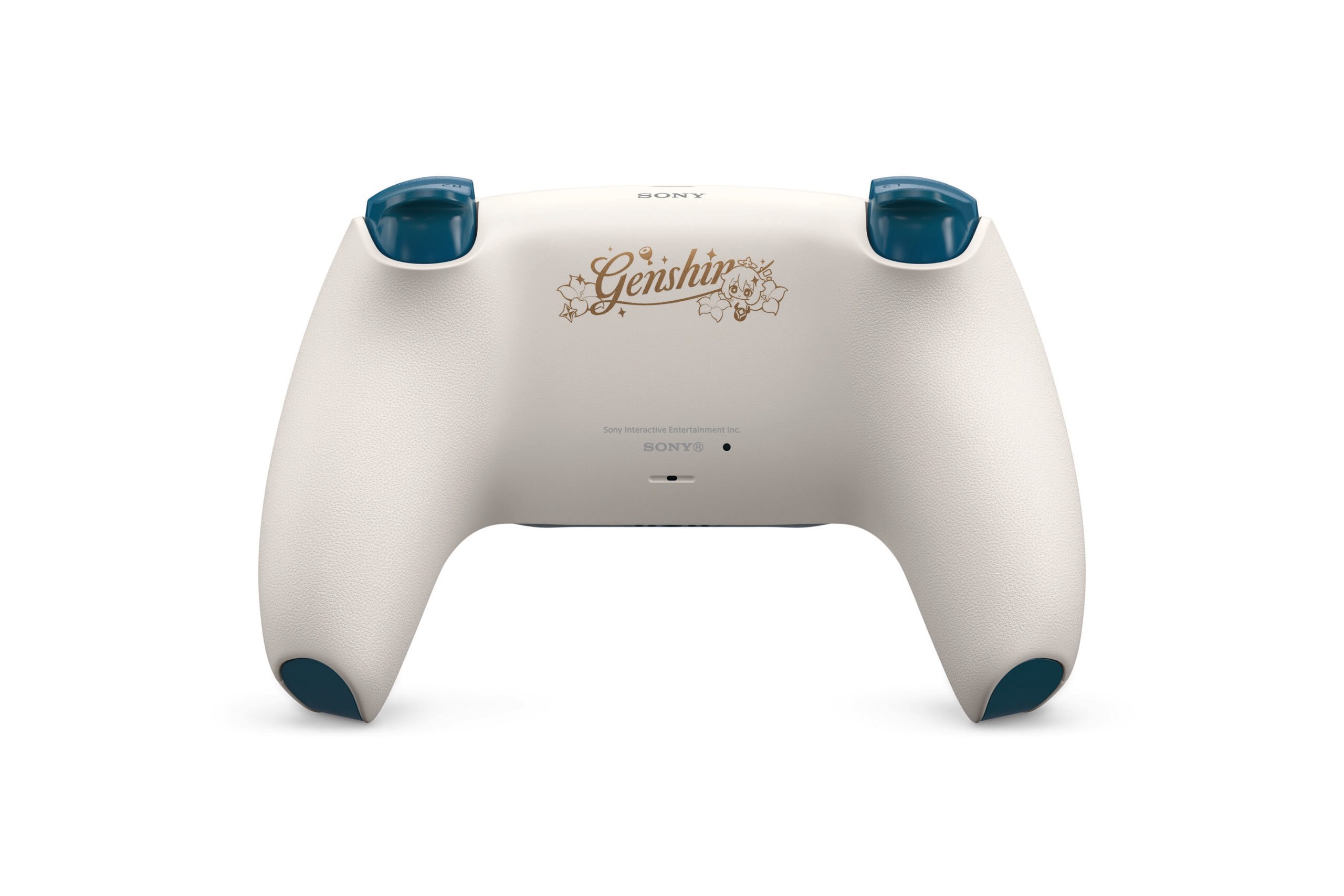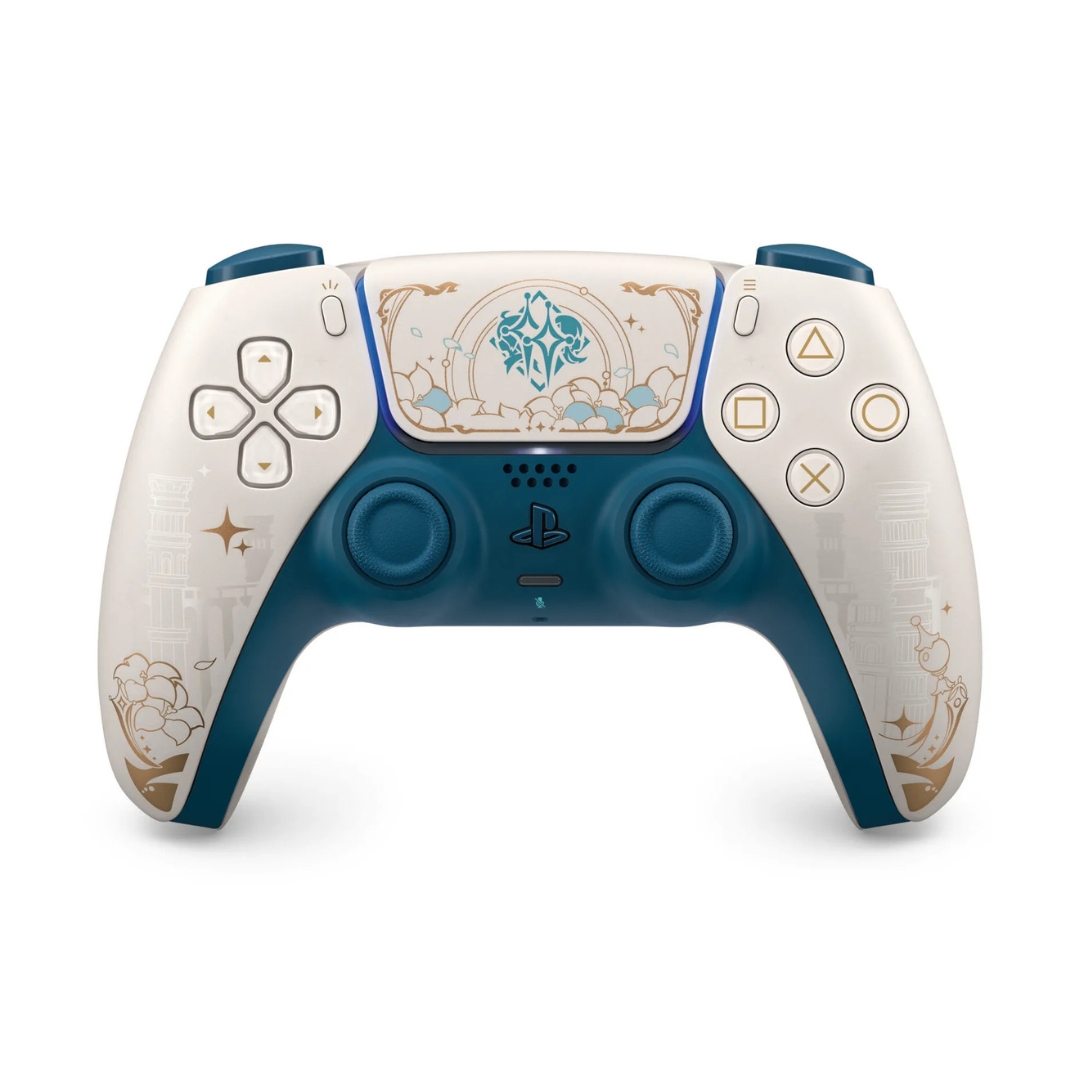 在 PlayStation®5 上使用 DualSense 無線控制器 –《原神》限量版 《原神》限量版,在「提瓦特」世界中精通元素力量。 –以空靈的白、金和綠色配色,展示雙子旅行者「空」與「熒」的標誌,以及最受信賴的嚮導「派蒙」,並飾有奇幻國度的神祕符紋。