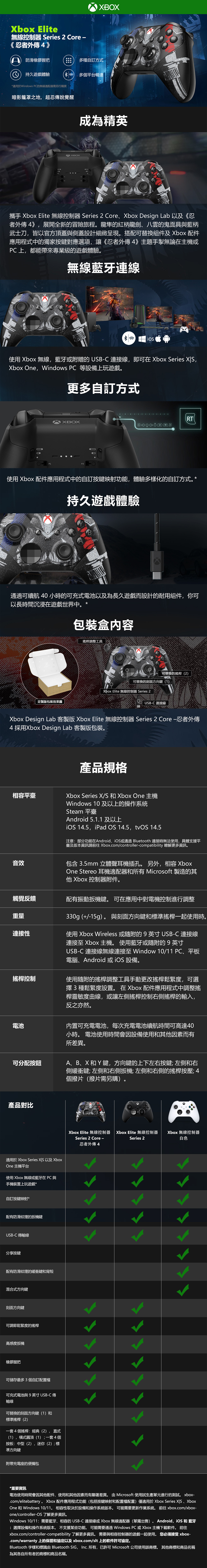 搭配 Xbox 系統和執行 Windows 7 或更新版本的電腦使用。Windows 10/11:需要藍牙、隨附的 USB 纜線或 Xbox 無線配接器 (需另購)。Windows 7 或 8.1:需要隨附的 USB 纜線;有些功能不受支援。請至 xbox.com/xboxone/PC-controller 下載驅動程式。 |