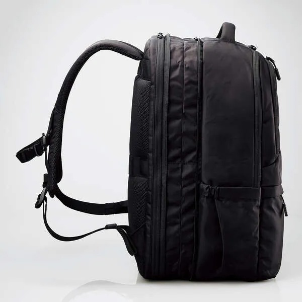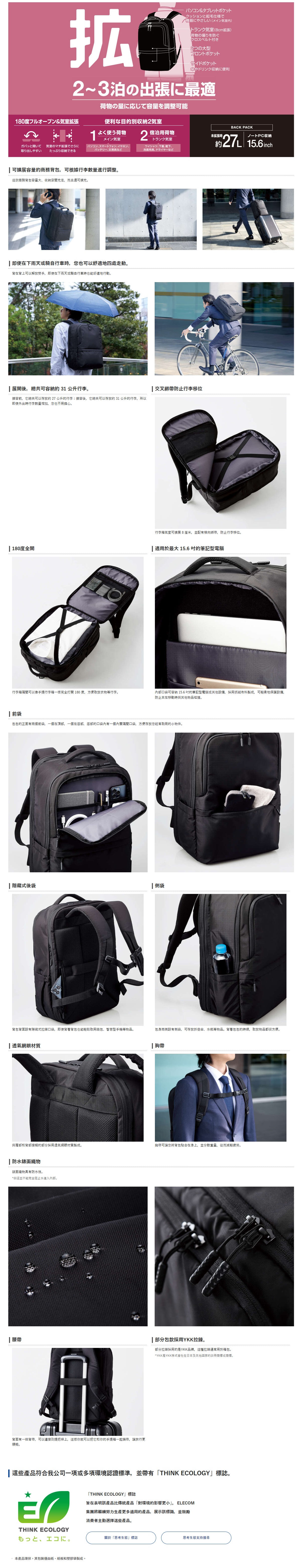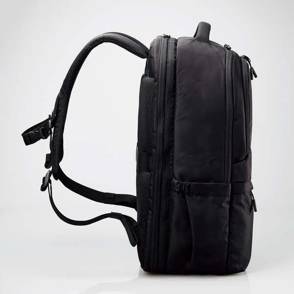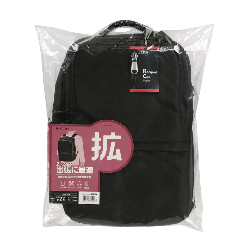 ELECOM BM-BPEPBK 擴張型大容量商務背包 (黑色),專為通勤與商務旅行設計。未擴張時可收納約 27 公升,擴張後可達 31 公升,能靈活應對行李增減。背包採用 180 度全開設計,方便如同行李箱般整理物品,並具備防潑水材質、多重收納口袋與筆電保護隔層,兼具專業外觀與實用功能。