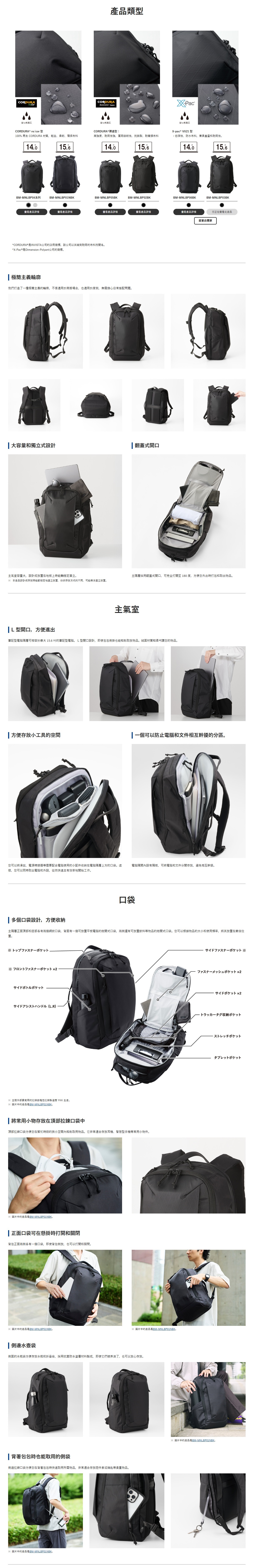 - ▸ 前置、側面、背面多功能口袋,收納靈活
