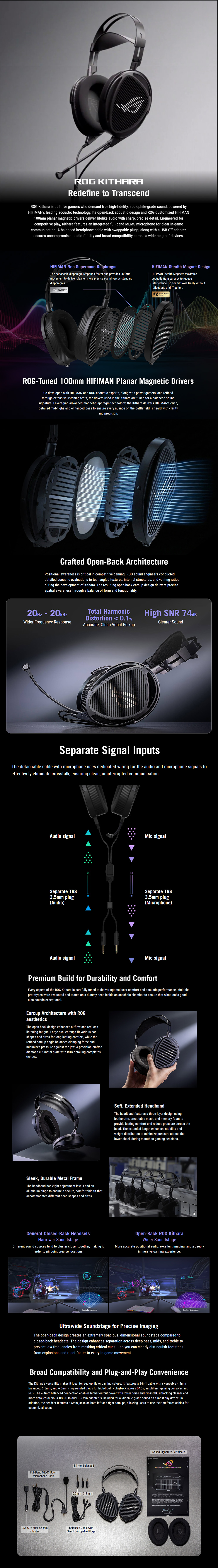 ASUS ROG Kithara 遊戲耳機,搭載 ROG 調校的 100mm HIFIMAN 平面磁性驅動單體、開放式設計、全頻 MEMS 麥克風、雙 3.5mm 輸入、4.4mm 平衡、3.5mm、6.3mm 單端插頭