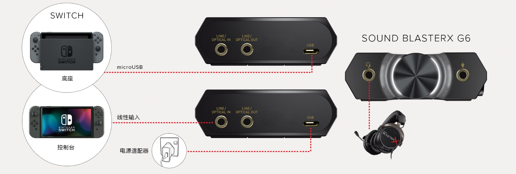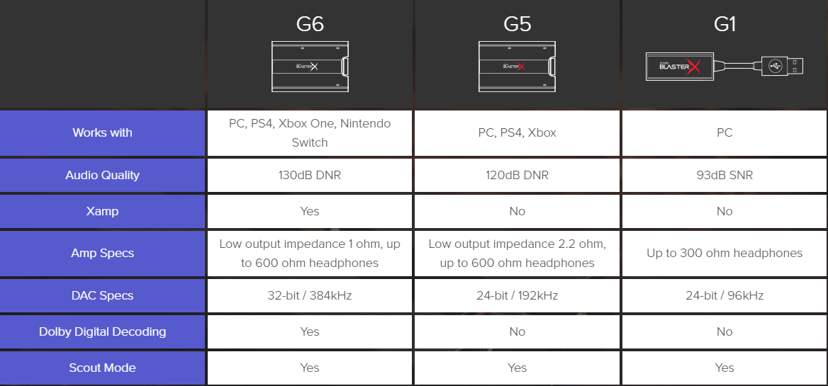 可與PS4,Xbox One,Nintendo Switch和PC一起工作的USB聲卡,配有32位/ 384kHz,130dB USB數模轉換(DAC),Xamp分立式耳機放大器和杜比數字解碼功能,虛擬7.1環繞聲,遊戲語音音量平衡,Scout Mode和Sound Blaster的聲音增強技術。