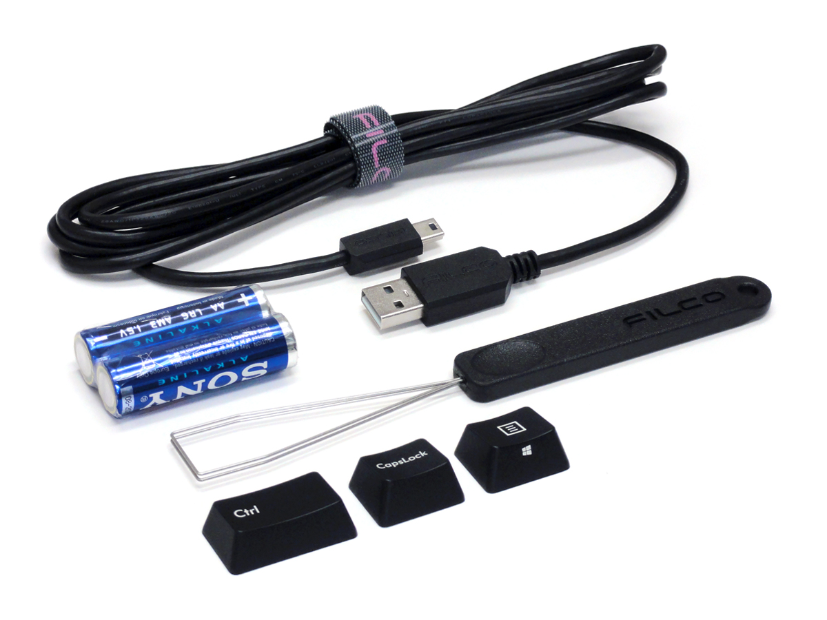 AA鹼性電池 x2、Filco拔鍵器、替換用鍵帽 x3、USB線。