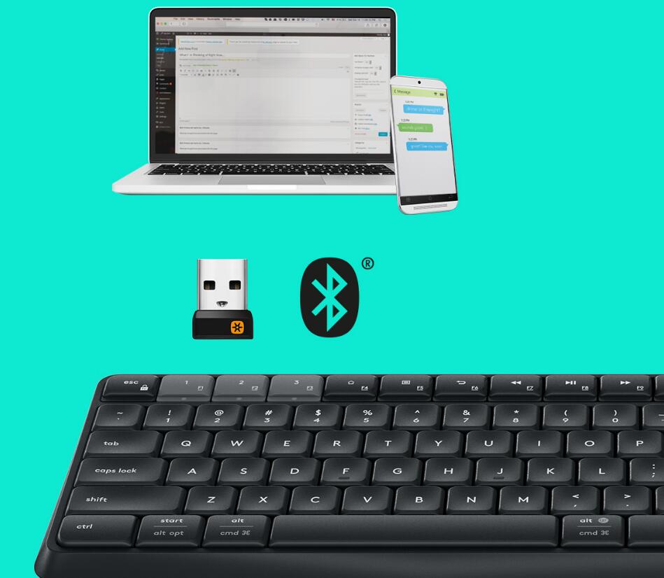 使用超小型羅技 Unifying 接收器連線到電腦,使用 Bluetooth®Smart 技術連線到手機或平板電腦。K375s 無線鍵盤支援這兩種技術,可在遠達 10 公尺的範圍內使用,提供快速資料傳輸、無線加密、無延遲或無中斷的連線*。