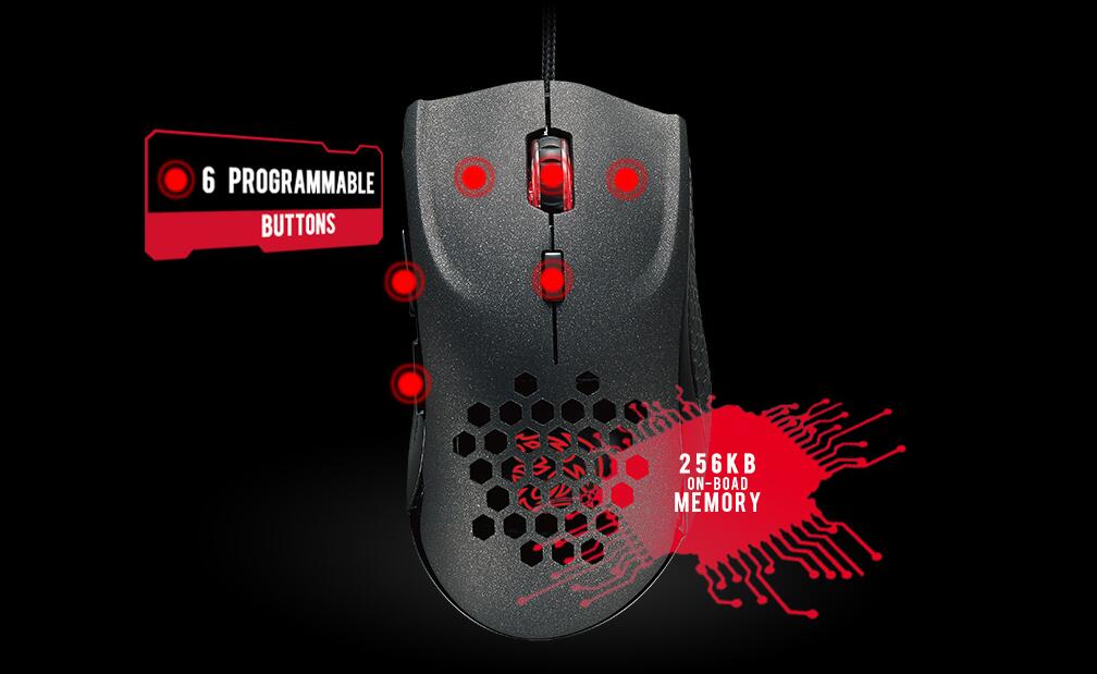 夜襲【X】 RGB光學引擎電競滑鼠擁有內建256K內建記憶體儲存空間、6顆可編程按鍵與5組設定檔,並且可進行DPI調節、燈光的配置等,讓您快速保存您最喜愛的個人設定,並且適用於任何一台PC。