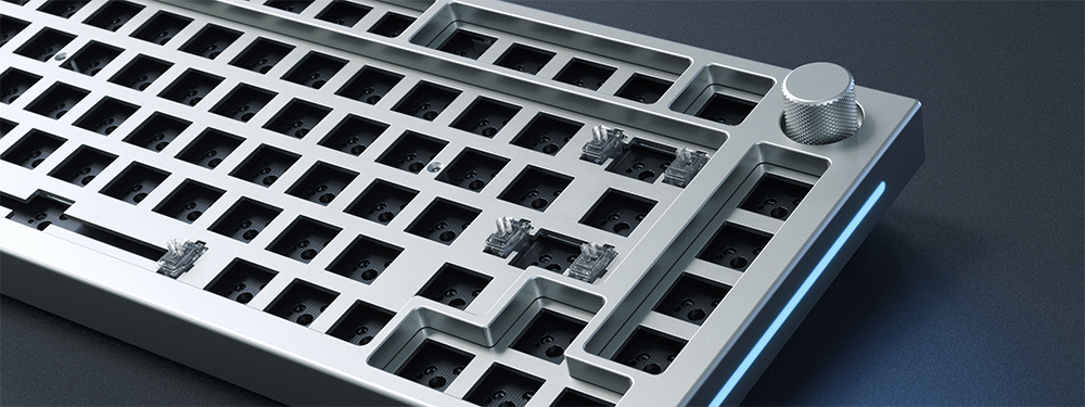 現時DIY鍵盤最灸手可熱的結構,將軟性墊片分別夾住定位板,再以上下蓋用螺絲收緊夾住墊片的安裝方式,將定位板緊緊咬死固定不會移位,敲擊時墊片將經定位板傳遞的衝擊吸收,不會傳到外殼上,令力度分佈更平均,手感反饋更佳。這個結構也有助減低使用時的空腔聲,令鍵盤用起來也可以如彈琴般追求音色。