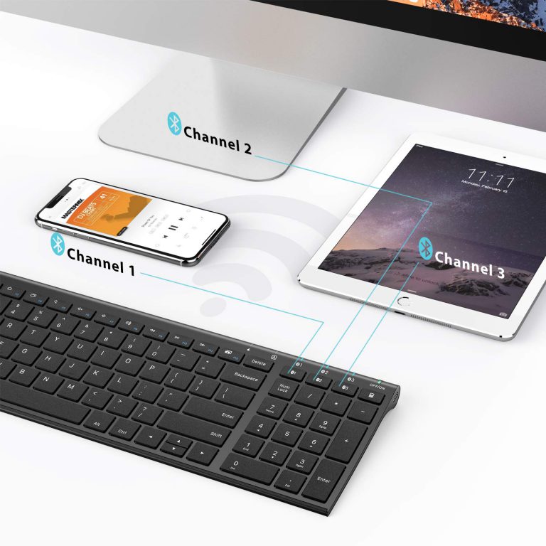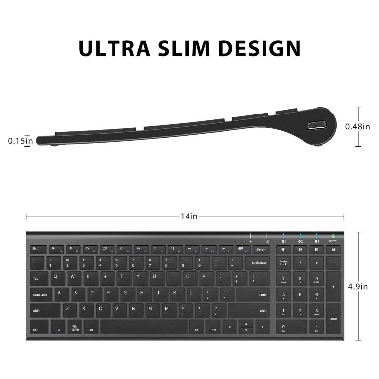 全尺寸和超薄鍵盤-iClever無線鍵盤為全尺寸設計,並包括數字鍵盤,與其他鍵盤相比,它使打字更輕鬆,更舒適。它的佈局是行業標準,具有諸如靜音,播放/暫停,後退和前進,音量增大和減小之類的熱鍵,可幫助您增加工作流程和生產力。無線鍵盤的超薄設計(14×4.9×0.15英寸)確保可以輕鬆將其塞入背包或筆記本電腦的口袋中。