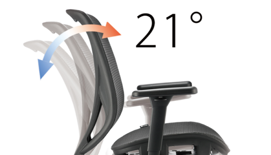- 椅背可後傾 21°,並可調整壓力和提供 3 段固定