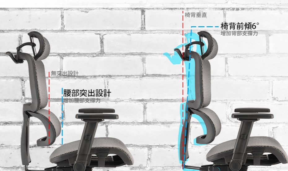 椅背除了原有的突出設計與後仰角度, 現在還增加了前傾角度, 提供更舒適的伏案坐姿, 擴展使用者在不同情境的舒適體驗。