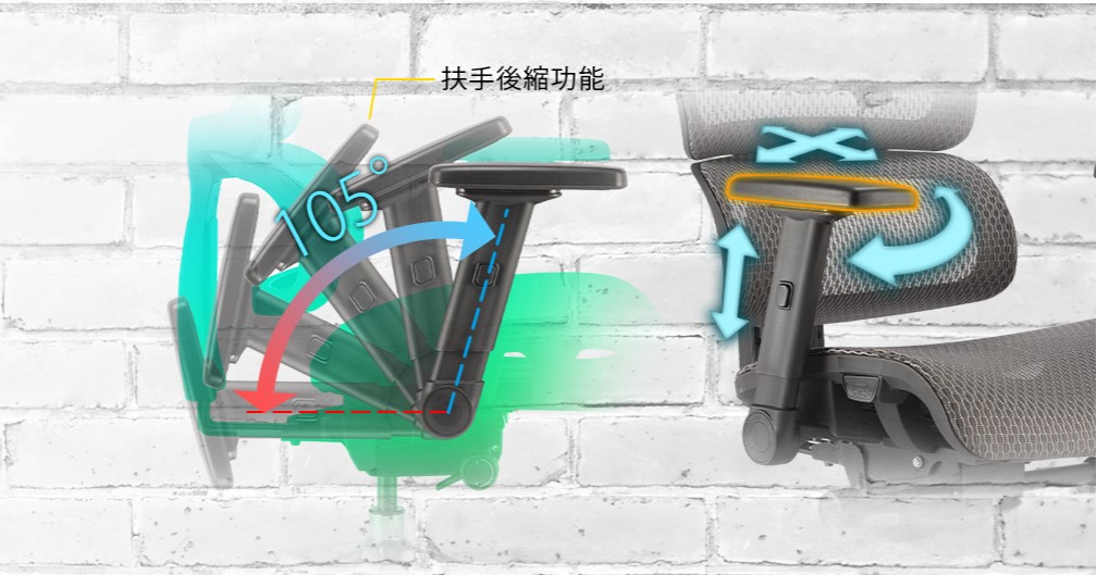- 椅背型式: 舒適全網布四段升降椅背(含衣架功能)