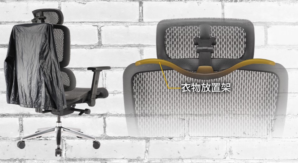 不同於市面上普通的網椅, T07PLUS的椅背上有著不同的巧思, 那就是衣架設計,衣著整齊才能給人好的印象, 一張好的椅子不只能提供好的體態, 還能給你好的衣著。