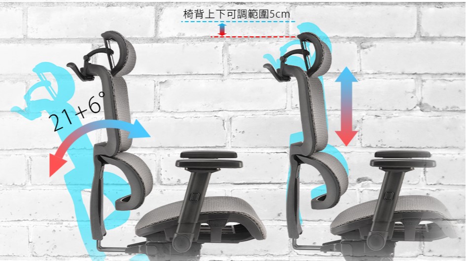 - 椅背傾仰角度 : 21+6° (前傾6°,後仰21° / 5段)
